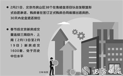 为了维护购房者权益,规范房地产市场秩序,2月21日,北京市房山区38个在售楼盘项目以自发联盟形式自愿承诺,购房者在签订正式购房合同前提出退房的,30天内定金退还到位。