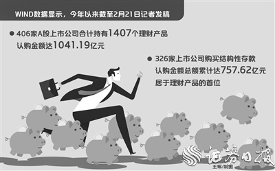 Wind数据显示,今年以来截至2月21日记者发稿,持有理财产品的A股上市公司共有406家,合计持有1407个理财产品,认购金额达1041.19亿元。