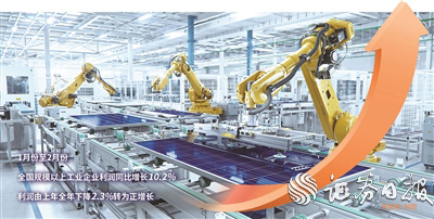 工业企业利润实现较快增长。1月份至2月份,全国规模以上工业企业利润同比增长10.2%,利润由上年全年下降2.3%转为正增长。分月看,规上工业企业当月利润自上年8月份以来同比持续增长,今年1月份至2月份延续恢复向好态势,工业企业效益起步平稳。