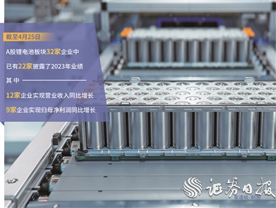 同花顺iFinD数据显示,截至4月25日,A股锂电池板块32家企业中,已有22家披露了2023年业绩,其中12家企业实现营业收入同比增长,9家企业实现归母净利润同比增长。