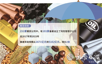 截至目前,151家期货公司中有101家备案设立了风险管理子公司,自2017年到2023年,基差贸易规模从1671亿元到5102亿元,增长2倍,场外衍生品业务成交名义本金规模从3330亿元增至3.18万亿元,规模增长8.55倍。